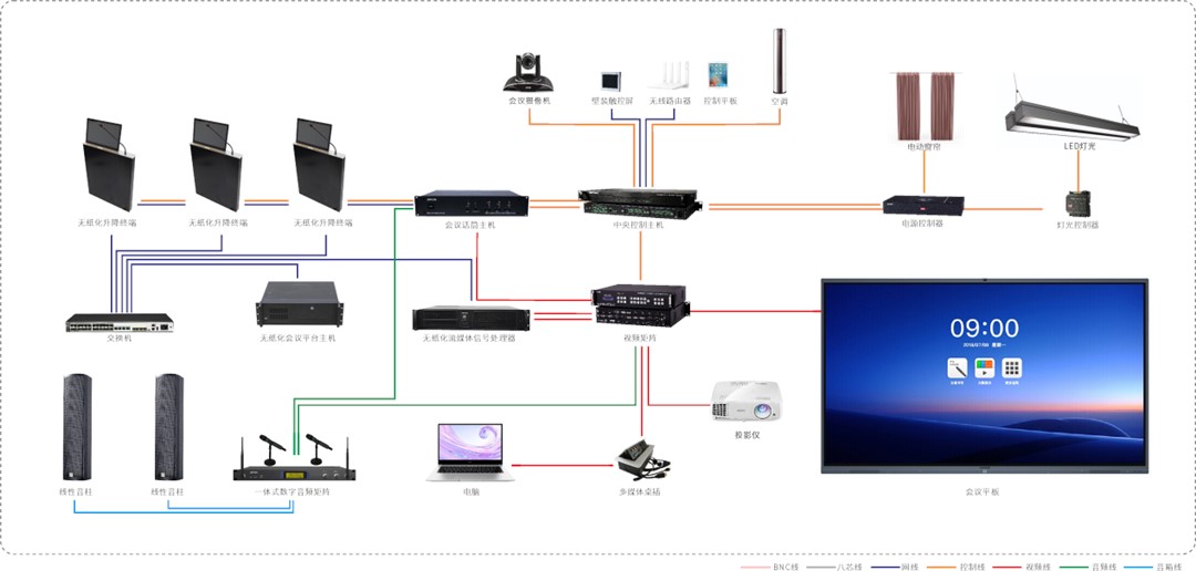 中控矩陣系統(tǒng)為智能多媒體會(huì)議室系統(tǒng)設(shè)計(jì)靈魂,集中了燈光、機(jī)械、投影及視音頻控制手段于一體,為使用者提供簡(jiǎn)單、直接的控制界面,令使用者能方便地掌握整個(gè)空間環(huán)境各設(shè)備的狀態(tài)及功能。中控系統(tǒng)采用平板電腦進(jìn)行操作,根據(jù)會(huì)議室的時(shí)間使用情況,編輯運(yùn)行控制程序,下載到中控主機(jī)和平板電腦進(jìn)行控制運(yùn)行,達(dá)到音視頻切換實(shí)時(shí)操控,解決繁瑣操作。