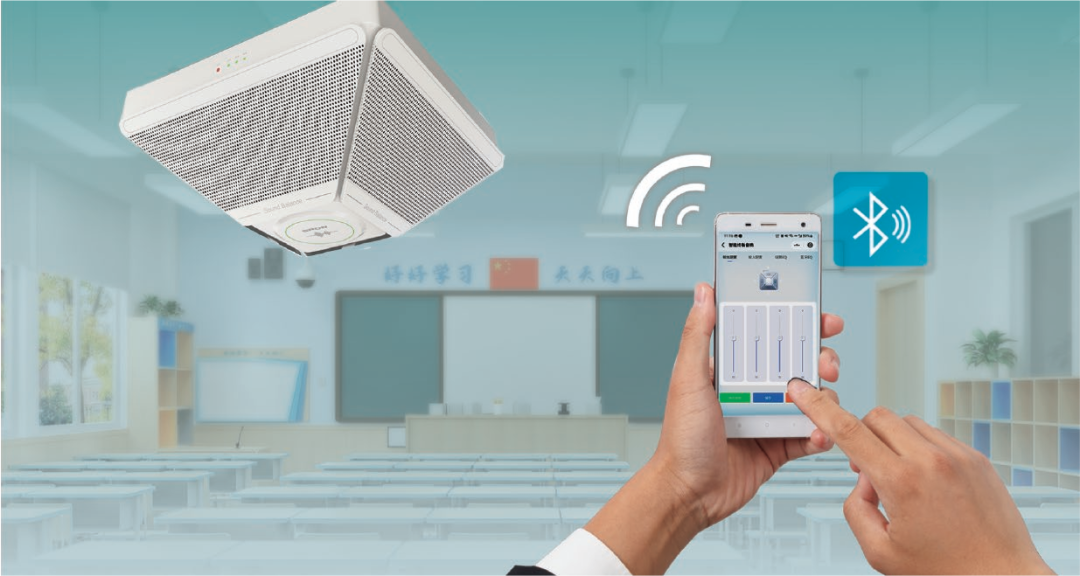 智慧教室均衡擴聲系統(tǒng)從根本上改善教室聲環(huán)境,保護聽力健康。系統(tǒng)支持手機APP調(diào)整配置。首次使用時,直接在手機APP進行設(shè)置、配網(wǎng)、音箱配置等功能,既能自主配置教室聲壓級在一個安全、合理、健康的范圍內(nèi),同時也能減少用戶學習成本,簡單易操作。系統(tǒng)支持藍牙音源輸入和線路音源輸入,滿足教學一體機的多媒體擴聲需求,能兼容多種設(shè)備,比如老師通過連接藍牙,就能播放手機里的音源資源,豐富課堂互動與交流,提升授課效果。系統(tǒng)還配置了無線話筒對頻使用,操作簡單,即連即用,搭配IP智能均衡音箱實現(xiàn)本地擴聲,老師在“自然聲”狀態(tài)下就能實現(xiàn)傳播音質(zhì)清晰柔和,告別以往“喊嗓子”。系統(tǒng)尊重和關(guān)注教師的身體健康,讓廣大教師能安心從教、舒心從教、靜心從教,倡導各位老師們“一師一麥”,注意個人衛(wèi)生防護。
