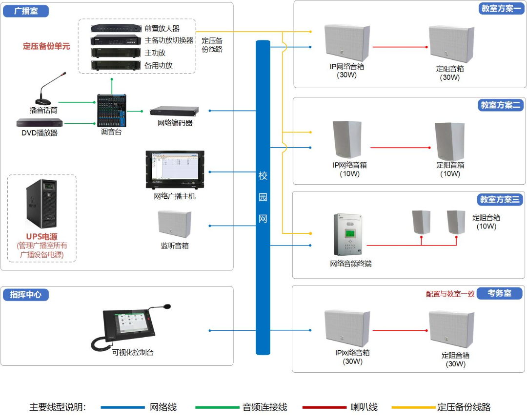 每個(gè)教室均設(shè)計(jì)單獨(dú)廣播分區(qū)控制,提供三種方案選擇。