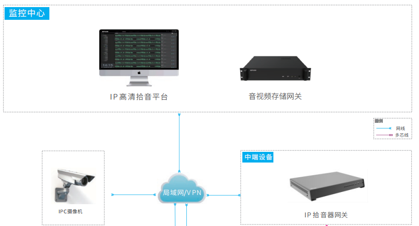 這是目前最常見(jiàn)的部署方式。物理連接上,模擬拾音器通過(guò)音頻線接入網(wǎng)絡(luò)攝像機(jī)的“Audio In”接口。攝像機(jī)將編碼后的視頻流與音頻流封裝在一起,形成一個(gè)包含音畫(huà)數(shù)據(jù)的復(fù)合流。后端的NVR直接接收并存儲(chǔ)這個(gè)復(fù)合流文件。這種方式的優(yōu)點(diǎn)是天然同步,回放時(shí)無(wú)需復(fù)雜的對(duì)齊操作。