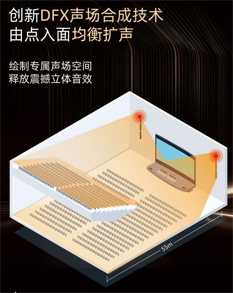 針對上述方案的痛點,世邦(SPON)推出的可調(diào)指向線性陣列音柱為中大型會議空間提供了更優(yōu)的解題思路。與傳統(tǒng)方案相比,其核心優(yōu)勢在于引入了先進的DFX聲場合成技術。
