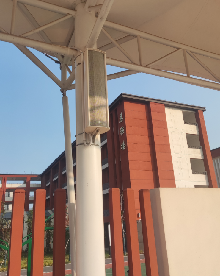 · 室外空間(立桿安裝): 室外環(huán)境背景噪聲大且單點覆蓋要求廣,通常將防雨音柱附著于路燈桿或?qū)S帽O(jiān)控立桿上。 安裝高度通常規(guī)范在 3.5米至4.5米 之間(大功率號角5米以上)。此高度不僅能避開貨車或工程車輛的刮擦、防止人為破壞,還能通過配合適宜的下傾角,實現(xiàn)更遠距離的有效聲場覆蓋。